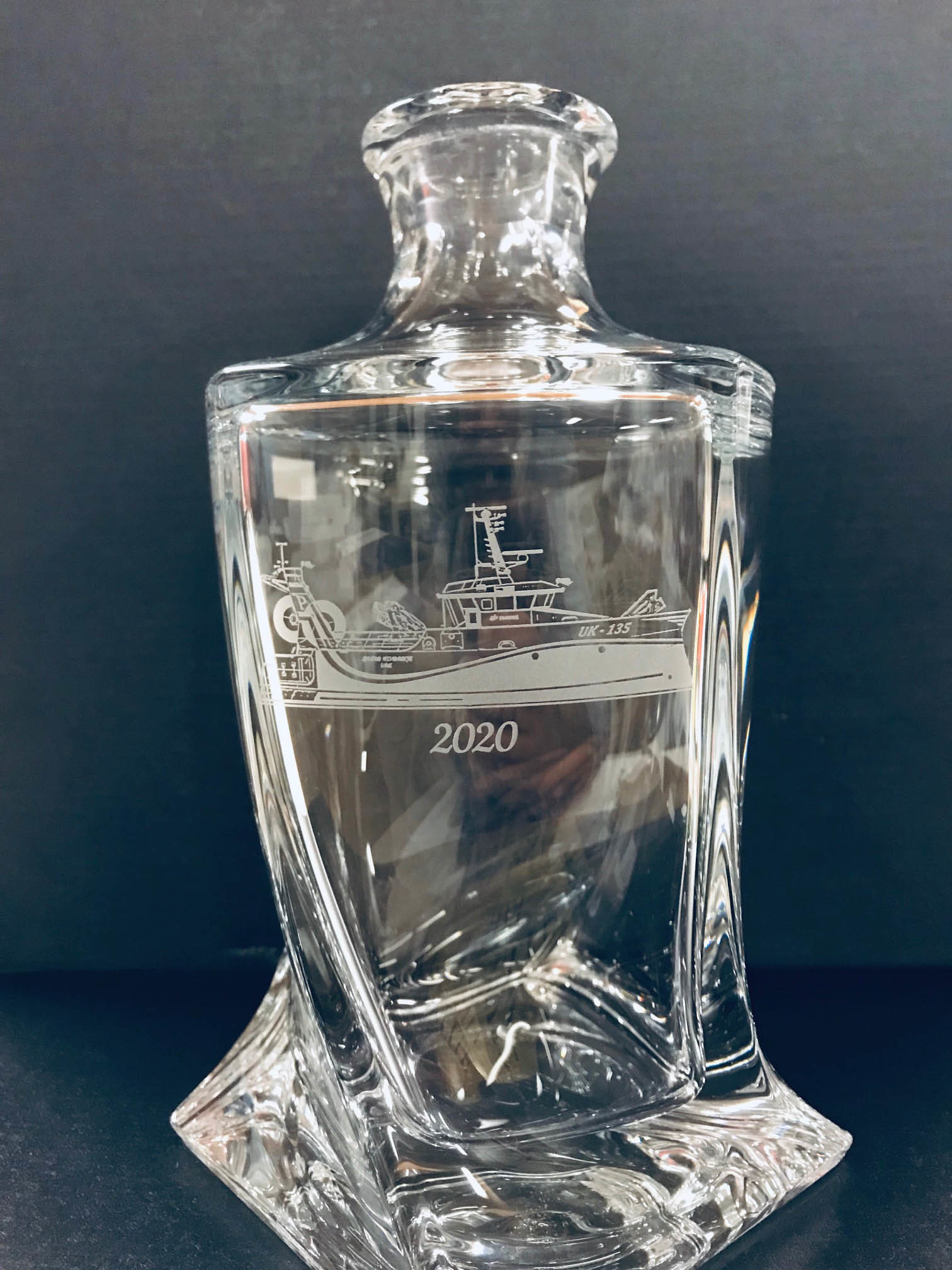 Het zand snijdt als het ware het glas op de plekken waar het sjabloon geen bescherming biedt. Hierdoor ontstaat een gelijkmatige, matte gravure die tot op milimeters nauwkeurig geplaatst kan worden. Na het zandstralen wordt de karaf gereinigd en gecontroleerd op perfectie.